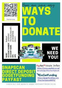 At The Charity Book we have tried to make it easy to contribute to our various causes that we will be introducing over time. Click on our Donations page and that will take you to safe and tested measures to give back – if you have a donation that is to be collected please email us on queries@thecharitybook.co.za or make contact via the Contact Us link – thank you!