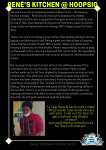 Hoopsig is a unique facility in Paternoster where they look after children in the afternoons – providing many valuable learning lessons and a comforting meal. Here they have René Victor who manages the kitchen and cooks alongside her 5 helpers and volunteers.